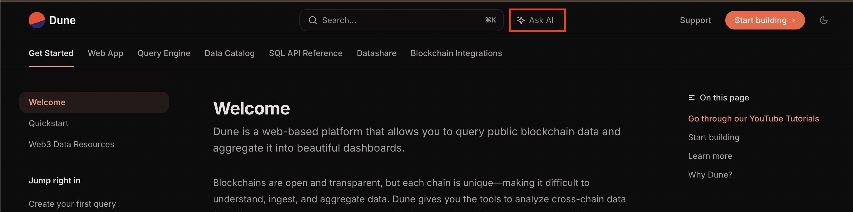 - Leverage AI assistance: Use the “Ask AI” feature throughout Dune documentation for quick help