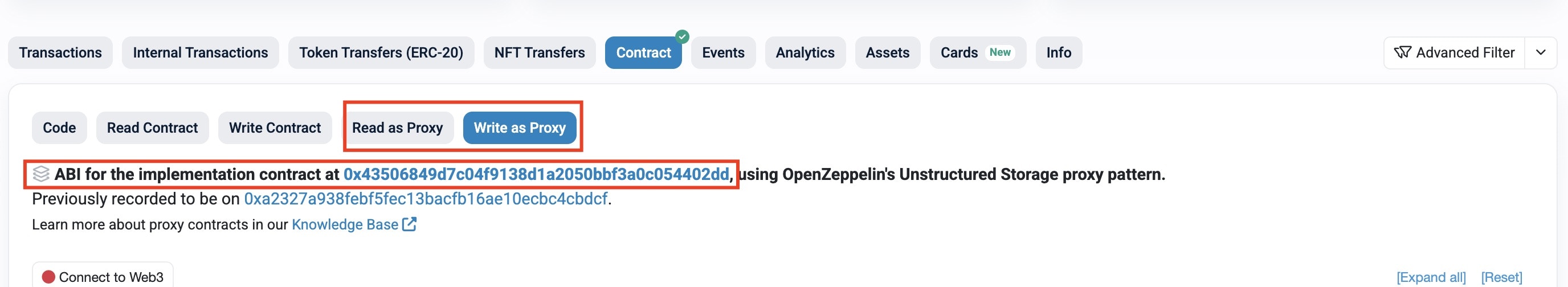 - To check if your contract is a proxy, you can visit a block explorer like etherscan.io and click into the “Contract” section. If you see “Read as Proxy” and “Write as Proxy” as the image below then select the ABI of the implementation contract.