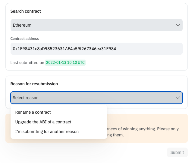 Sometimes you need to resubmit a contract because the name is originally submitted wrong, or you need to update the ABI. Follow the steps as guided. But if you are resubmitting for other reason not listed in the dropdown, provide as much detail as possible to avoid the resubmission being rejected.